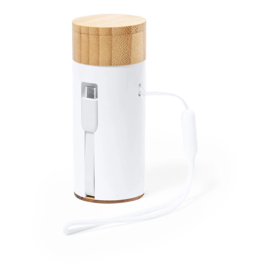 Power bank 4500 mAh, bezprzewodowe słuchawki douszne, BT 5.0, bateria słuchawek 30 mAh, elementy z bambusa, możliwość ładowania dwóch urządzeń jednocześnie, wyjście USB 5V/2.4A, wejście/wyjście USB-C 5V/2.4A, zintegrowany kabel w komplecie