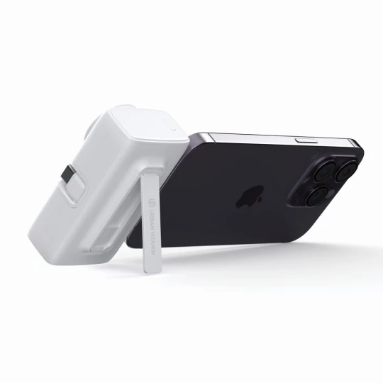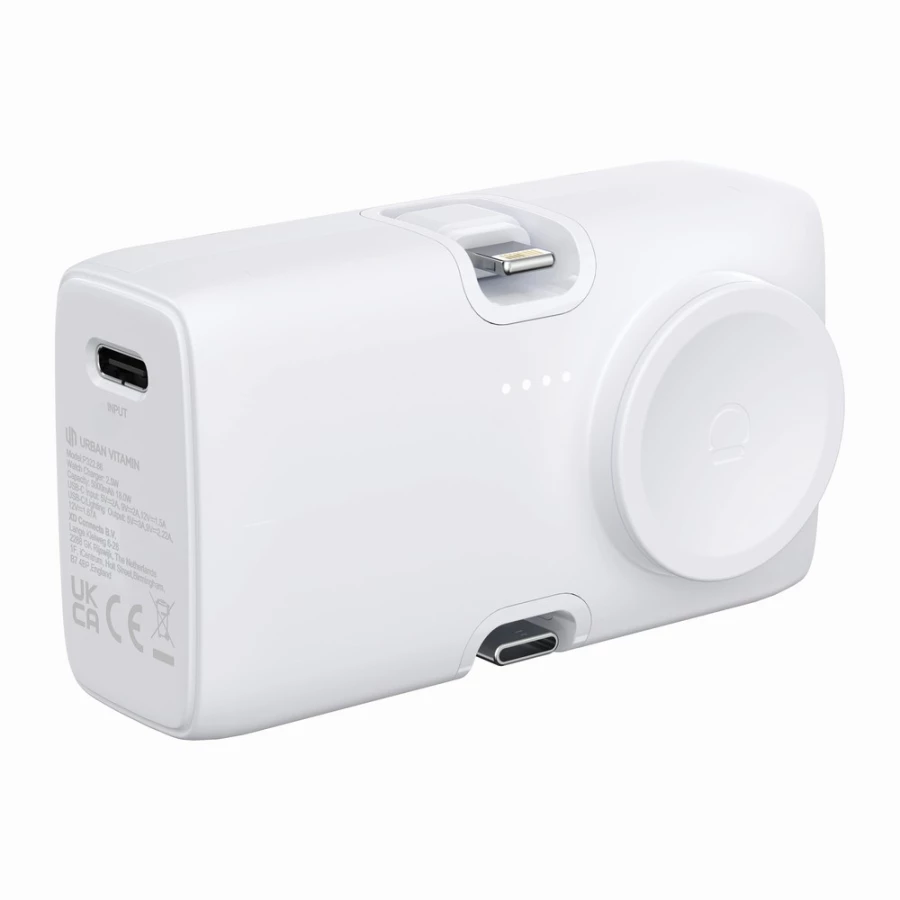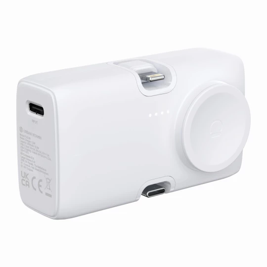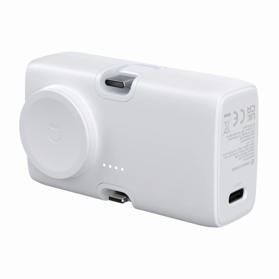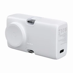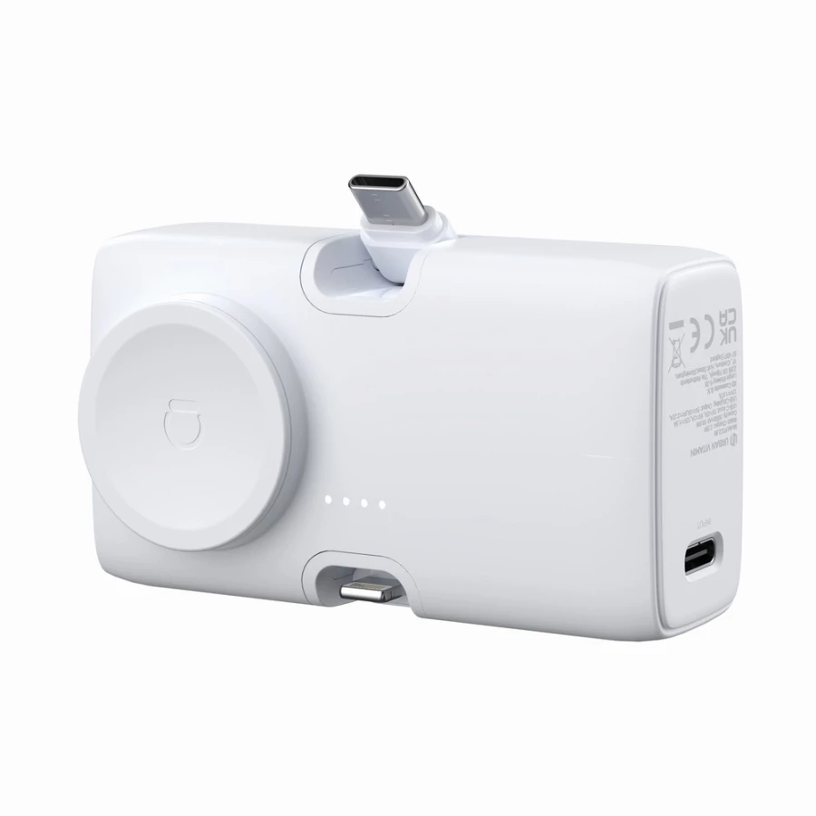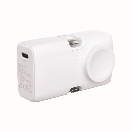 Power bank 5000 mAh, zintegrowana ładowarka bezprzewodowa do zegarka (tylko iOS), szybkie ładowanie do 20W, zintegrowane wyjścia USB-C i iOS, stojak na telefon, wyjście USB-C, działa z urządzeniami posiadającymi możliwość ładowania indukcyjnego, wykonana z ABS z recyklingu, całkowita zawartość materiałów z recyklingu obliczona na podstawie wagi całkowitej produktu: 24%