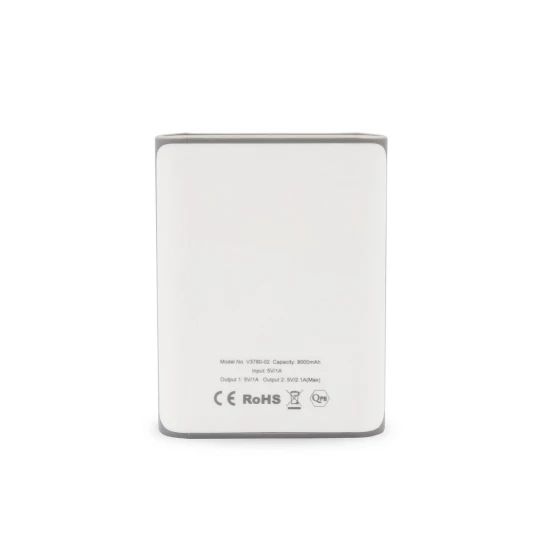 Power bank 8000 mAh, wyjścia 5V/2.1A oraz 5V/1A, wejście 5V/1A, 5 diod wskazujących poziom naładowania, lampka LED, w komplecie kabel micro USB