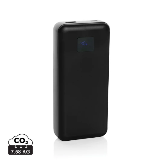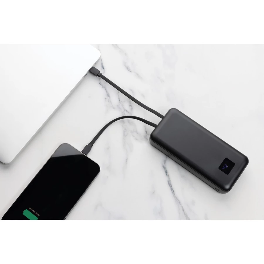 Power bank do laptopa 20000 mAh, moc ładowania przewodowego do 65W, która wystarczy do naładowania laptopa, zintegrowane kable USB C i iOS, wyświetlacz LED, wykonany z ABS z recyklingu z certyfikatem RCS, całkowita zawartość materiałów obliczona na podstawie wagi całkowitej przedmiotu: 23%, ślad węglowy produktu: 7,58 kg CO2
