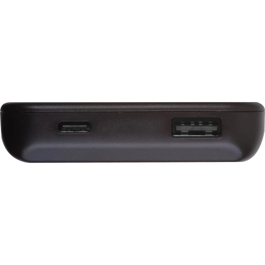 Power bank o pojemności 10 000 mAh, wykonany z ABS z recyklingu, z dwoma portami wejście USB-C 5 V/2,1 A oraz wyjście USB-A 5 V/2,1 A. Dołączony kabel do ładowania o długości 50 cm.