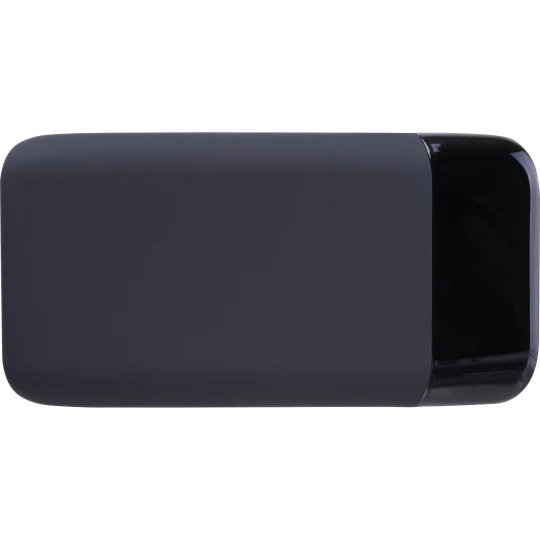 Power bank o pojemności 8 000 mAh z miękką, gumowaną powłoką oraz wyświetlaczem LCD. Power bank wyposażony w dwa wejścia USB i dwa USB-C, moc 5V 2 A. Logo zostanie wykonane metodą grawerunku laserowego i podświetlone wbudowanymi diodami LED.