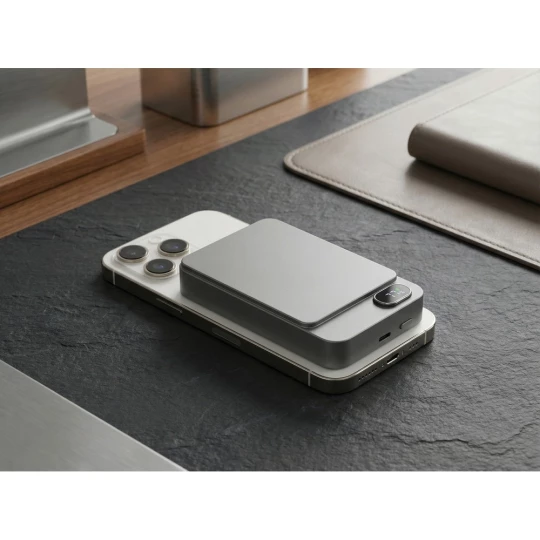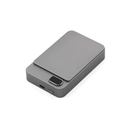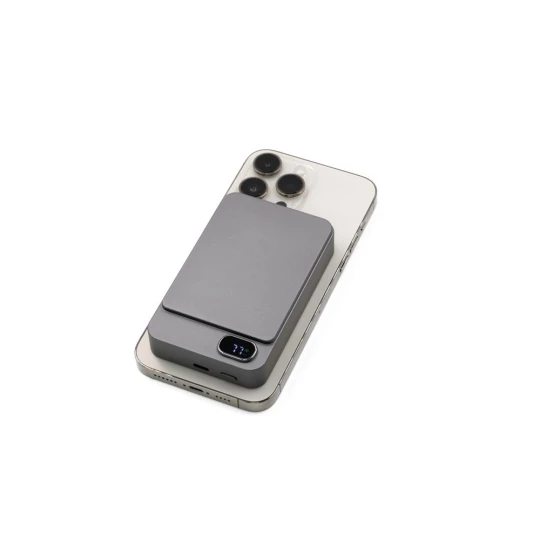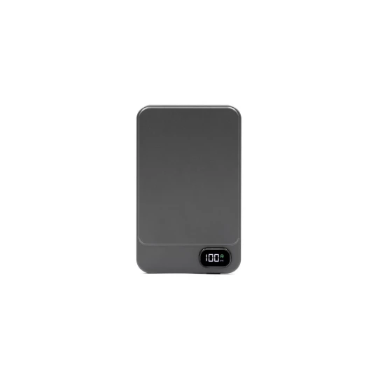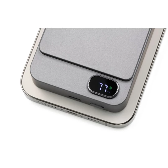 Powerbank BrandCharger Powerwave 10000, elegancka aluminiowa obudowa, pojemność 10 000 mAh, obsługuje szybkie bezprzewodowe ładowanie o mocy 15 W (kompatybilne z MagSafe, Qi1 i Qi2), port USB-C o mocy 20 W z PD 3.0 umożliwia zasilanie laptopów i innych urządzeń, wyświetlacz LCD pokazuje stan baterii, wyposażony w inteligentny chip, chroni urządzenia przed przetężeniem, przeładowaniem, przegrzaniem i zwarciem, zapewniając niezawodne i bezpieczne ładowanie, produkt wykonany z ABS i aluminium z recyklingu