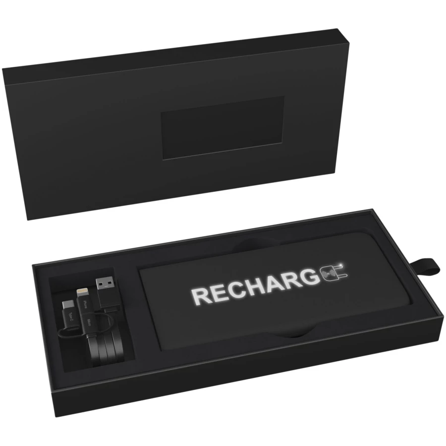 Ultracienki i ultralekki gumowany powerbank z podświetlanym logo wyposażony w aluminiowy kabel 5-w-1. Urządzenie rozświetla się po dotknięciu dzięki funkcji „shake”. Logo może świecić nawet przez 20 dni bez konieczności ładowania baterii. Możliwość wykonania nadruku digital. Pojemność: 5000 mAh. Podwójne wyjście DC: 5V/2A i 5V/2A do szybkiego ładowania. Wejście DC: 5 V/2A mikro-USB. Waga netto: 110 gramów. Wymiary: 138 x 66 x 8,5 mm. W zestawie znajduje się pudełko upominkowe wykonane z papieru z recyklingu.