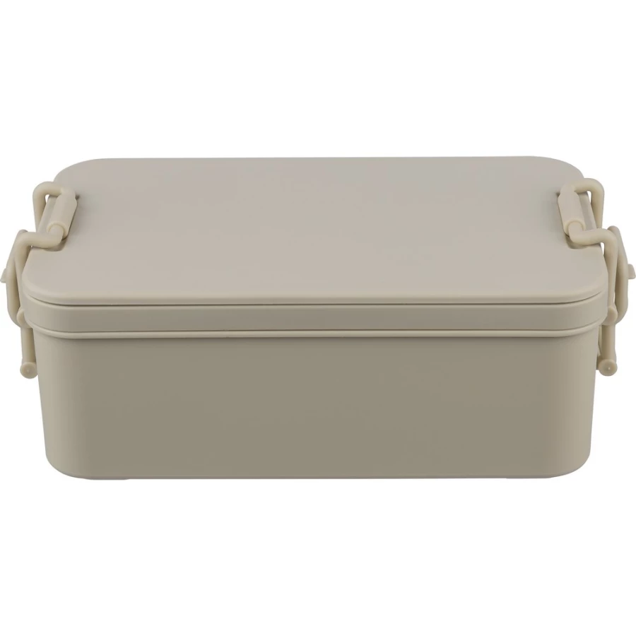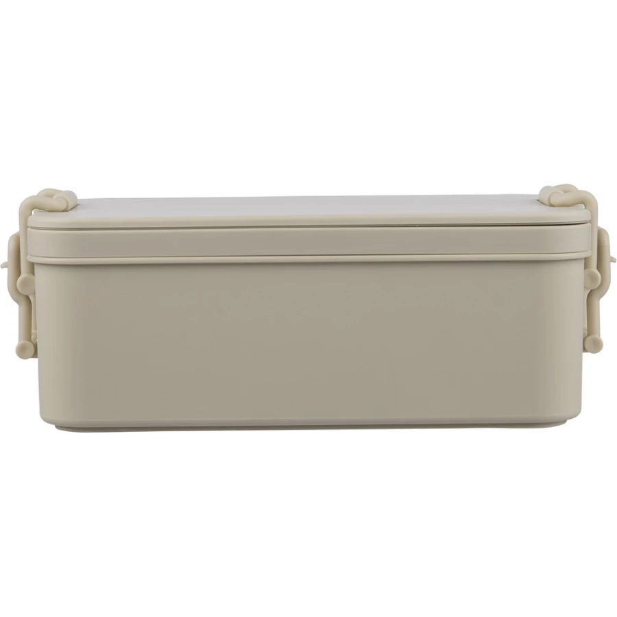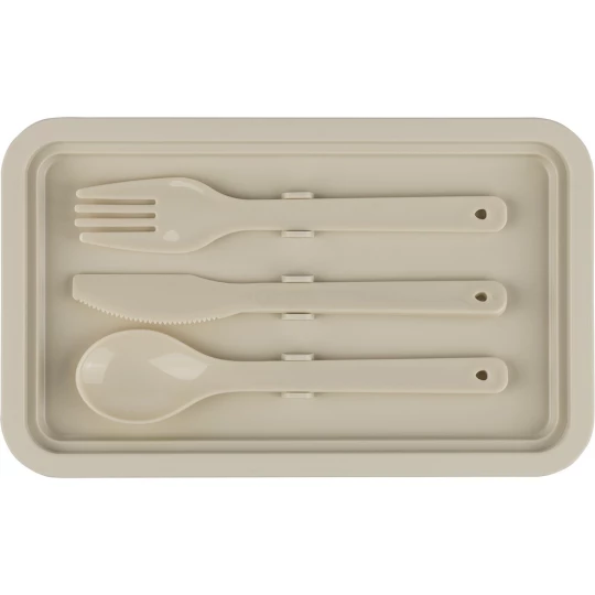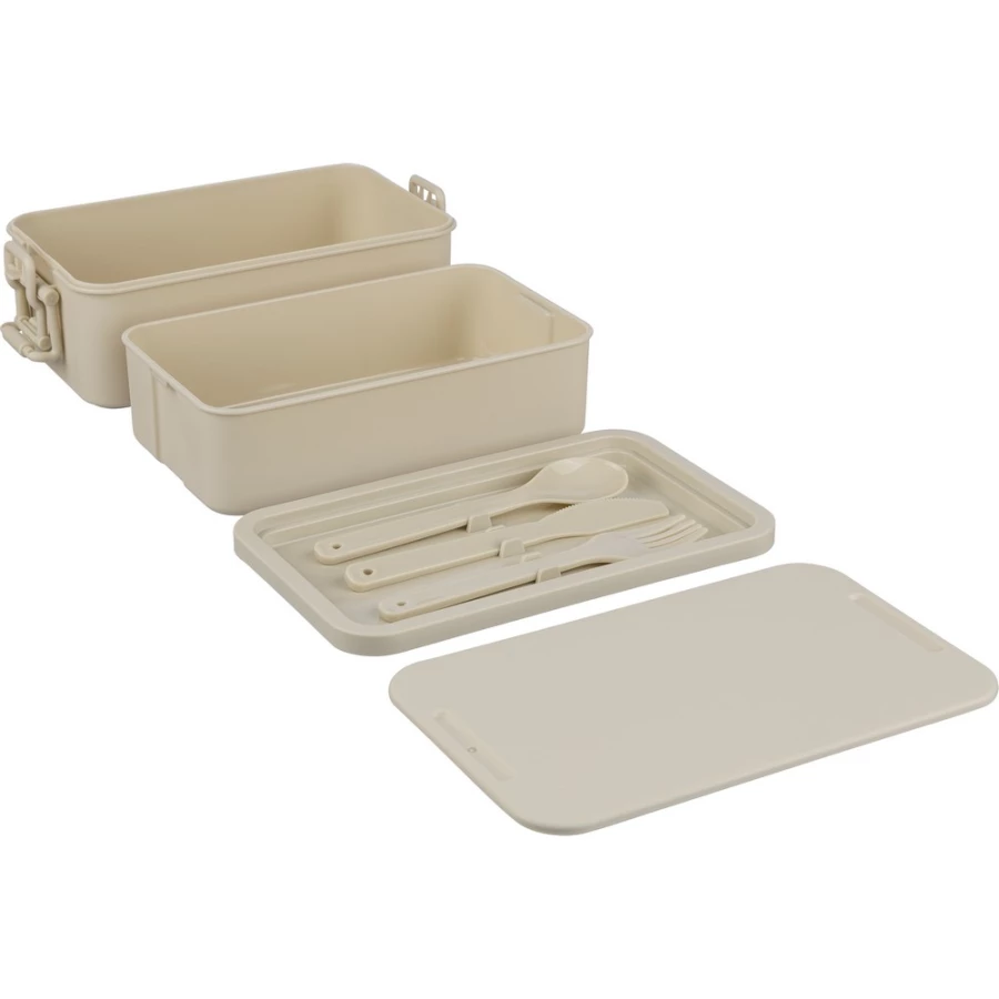 Pudełko śniadaniowe o pojemności 2,2 litra, dwie warstwy, miejsce na sztućce, zamknięcie na klips, wieczko, 3 sztućce w komplecie, produkt wykonany z PP