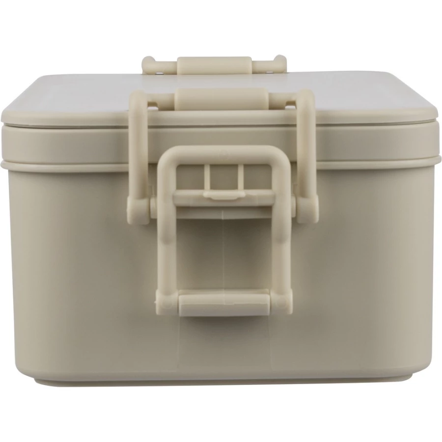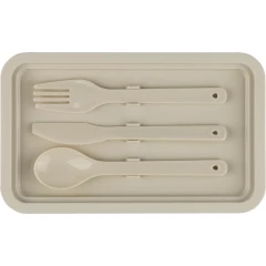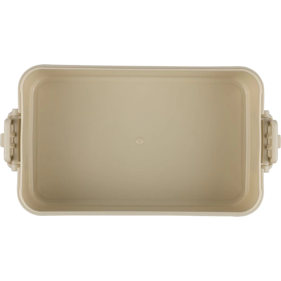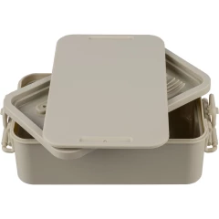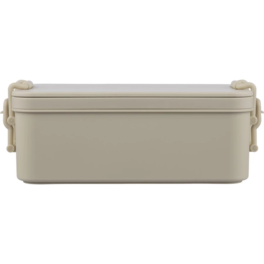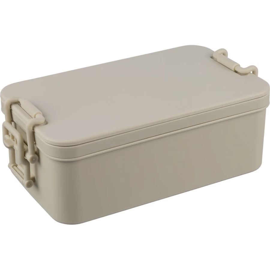 Pudełko śniadaniowe o pojemności 2,2 litra, dwie warstwy, miejsce na sztućce, zamknięcie na klips, wieczko, 3 sztućce w komplecie, produkt wykonany z PP