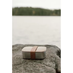 Pudełko śniadaniowe, lunchbox, drewniana pokrywka, pasek na rzep, wykonane ze stali nierdzewnej z recyklingu, całkowita zawartość materiałów z recyklingu obliczona na podstawie wagi całkowitej przedmiotu: 40%, wyłącznie mycie ręczne, w pudełku z papieru kraftowego z certyfikatem FSC®
