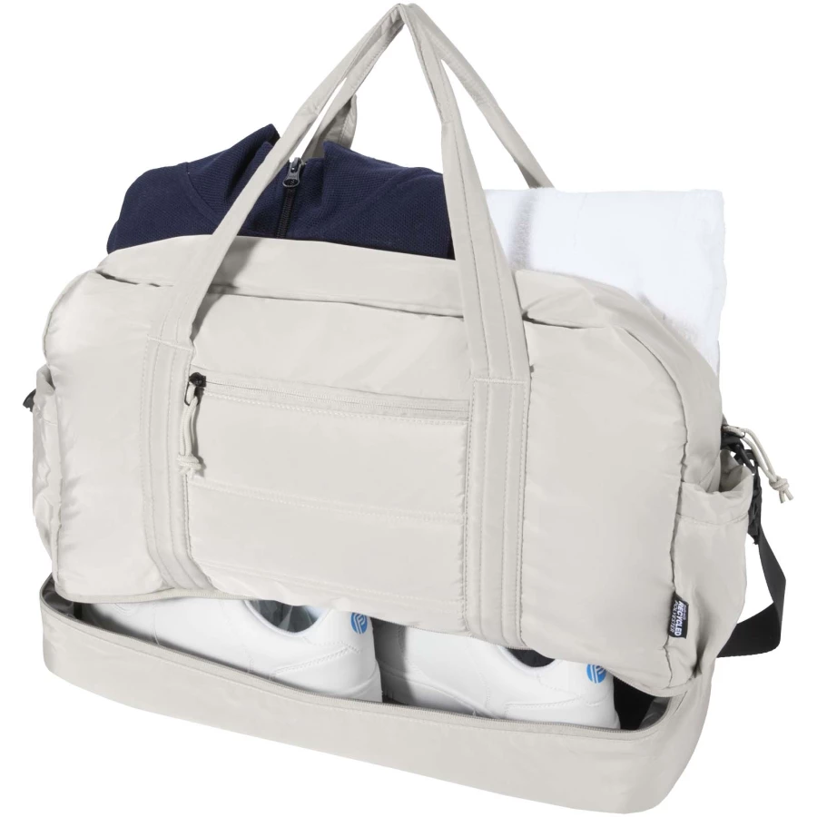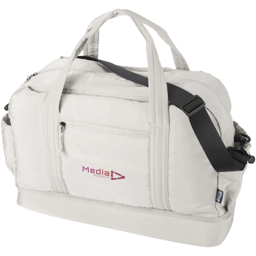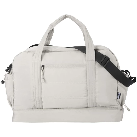 Torba podróżna Puffer łączy w sobie wyjątkowy design z najwyższej jakości materiałami pochodzącymi z recyklingu z certyfikatem GRS, dzięki czemu jest praktyczna i przydaje się na co dzień. Torba ma pojemność 30 litrów dzięki czemu idealnie nadaje się na krótkie wycieczki, na treningi na siłowni lub do codziennego użytku. Torba ta ma dużą, zapinaną na zamek komorę główną na ubrania i sprzęt, dolną komorę wyłożoną izolowaną folią PEVA, umożliwiającą oddzielenie mokrych i suchych rzeczy, a także liczne kieszenie wewnętrzne i zewnętrzne ułatwiające organizację. Pasek na bagaż, regulowany pasek na ramię i uchwyty zapewniają wszechstronne możliwości noszenia. To lekka i wodoodporna torba podróżna zaprojektowana tak, aby bez trudu dopasować się do Twojego stylu życia.
