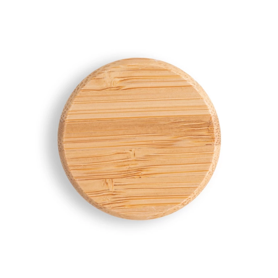 Aluminiowa butelka z bambusową nakrętką i matowym wykończeniem z brokatem. Pojemność do 550 mL. Ponieważ produkt jest wykonany z naturalnych materiałów, kolor produktu oraz wynik drukowania mogą się różnić w zależności od produktu. ø65 x 197 mm