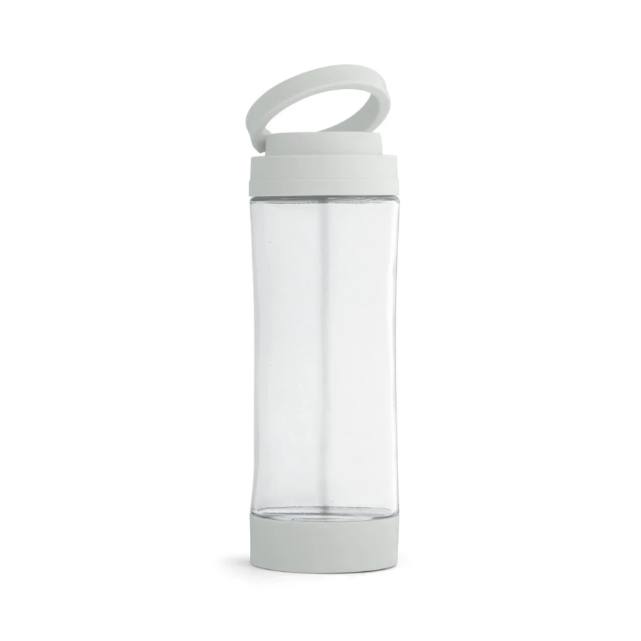 Szklana butelka sportowa z zakrętką z PP. Zawiera uchwyt na smartfona i uchwyt ułatwiający transport. Pojemność do 390 mL. Dostarczany w pudełku. ø61 x 181 mm