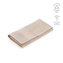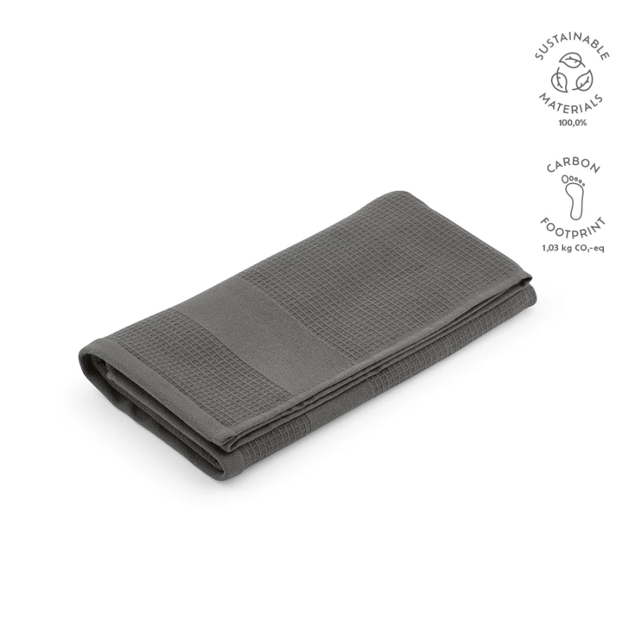 Nasz ręcznik waflowy z bawełny z recyklingu (60% bawełny z recyklingu i 40% bawełny), wyprodukowany w Portugalii, to Twój urok. Ma gramaturę 500 g/m² i wymiary 30 x 50 cm. Ze stylową opaską z nadrukiem i poręcznym bawełnianym wieszakiem, dostarczany jest w przyjaznej dla środowiska biodegradowalnej torebce foliowej.