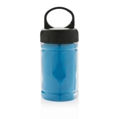 Ręcznik chłodzący z mikrofibry w pojemniku z PP, wieczko z ABS, ochrona przeciwsłoneczna na poziomie 98% i do UV 50+, funkcja chłodzenia po wlaniu zimnej wody do butelki, karabińczyk w komplecie, wymiar po rozłożeniu 77 x 30cm, ślad węglowy produktu: 0,8 kg CO2