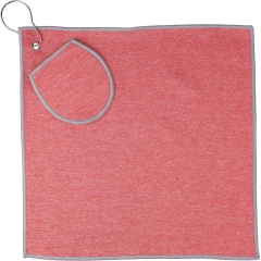 Ręcznik golfowy, z wbudowaną kieszonką na piłkę golfową, wyposażony w metalowy haczyk umożliwiający łatwe przymocowanie do torby, wewnątrz znajduje się ikona RPET na metce, można prać w pralce (na zimno), produkt wykonany z RPET