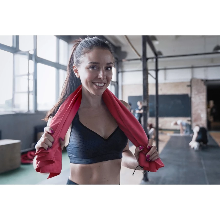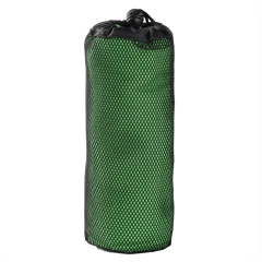 Ręcznik w czarnym, siateczkowym pokrowcu zamykanym na sznurek z klipem, produkt wykonany z mikrofibry o gramaturze 200 g/m2