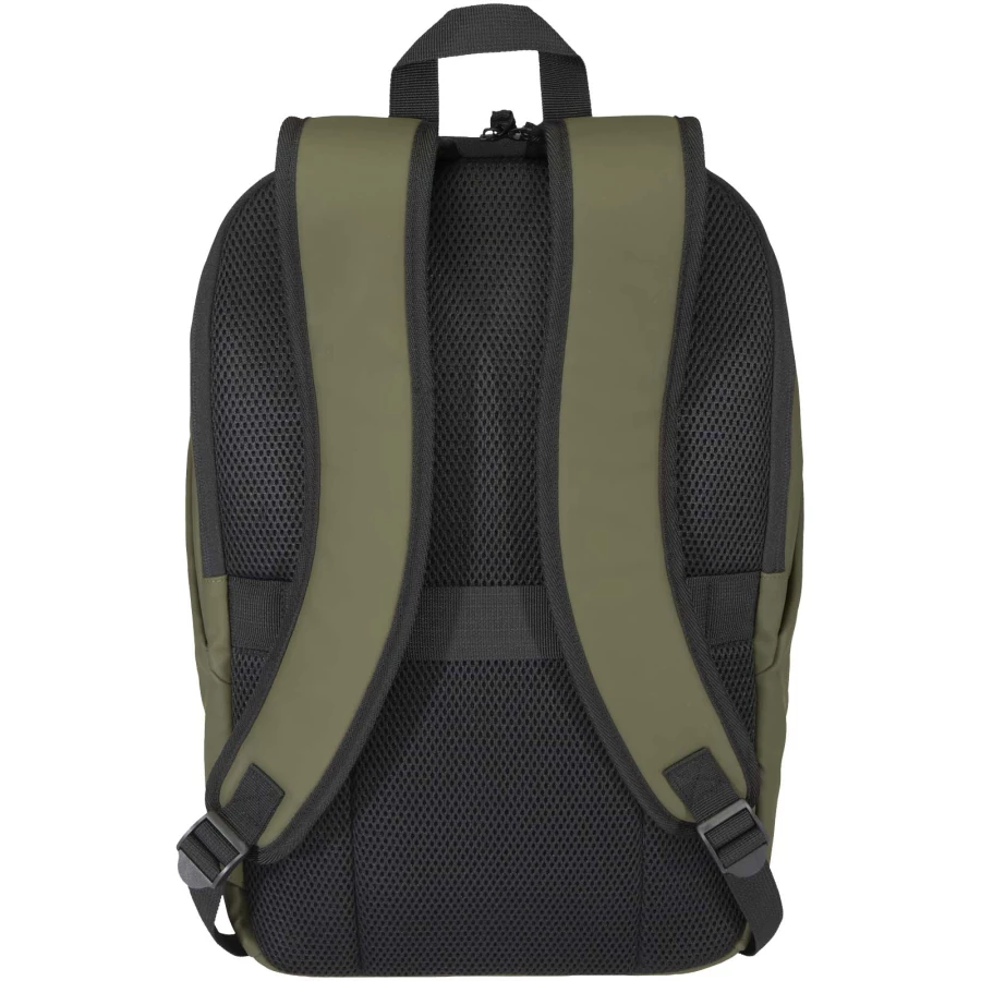 Plecak na laptop 15-calowy wykonany z najwyższej jakości skóry poliuretanowej (PU) z certyfikatem GRS pochodzącej z recyklingu, z podszewką z tworzywa RPET w dopasowanym kolorze, z zabezpieczeniem antykradzieżowym zapewniający ochronę i suchość Twoich rzeczy w podróży. Ma tylną przegrodę na laptopa, dwie opływowe kieszenie boczne i przednią kieszeń zapinaną na suwak z wodoodpornym zamkiem. Oddychający tylny panel gwarantuje całodzienny komfort, dzięki czemu plecak idealnie nadaje się do dojazdów do pracy, podróży i miejskich przygód. Pojemność: 18 litrów.