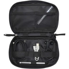 Wykonany z certyfikowanej przez GRS skóry PU pochodzącej z recyklingu, z dopasowaną podszewką z RPET, pokrowiec techniczny został zaprojektowany z myślą o podróżnikach, pracownikach zdalnych i entuzjastach technologii. Jest kompaktowy i łatwy do przenoszenia w plecaku lub w torbie. Posiada główną komorę zapinaną na zamek błyskawiczny z praktycznymi elementami organizacyjnymi, w tym elastyczną pętlą na długopis, dwie siatkowe kieszenie na słuchawki douszne i drobne akcesoria, wzmocnioną przegrodę oraz wiele elastycznych pętli do bezpiecznego przechowywania kabli, pamięci USB i ładowarek. Na zewnątrz znajduje się przednia kieszeń z zapięciem na rzep, zapewniająca szybki dostęp, oraz wygodny uchwyt z taśmy. Dzięki wykończeniu wodoodporną powłoką, zabezpieczy Twoje przedmioty, gdziekolwiek jesteś. Pojemność: 1 litr.
