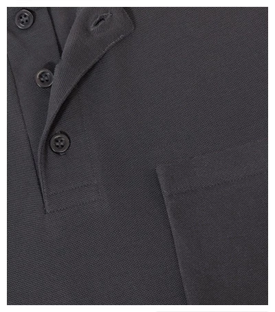 niekurczliwa bawełna odporna na wyższe temperatury, temperatura prania do 95 °C (biały) oraz 60 °C (kolor), krój z rozporkami na końcach bocznych szwów, kołnierzyk oraz lamówka z dzianiny ściągaczowej 1:1, plisy z 3 guzikami w kolorze materiału, wewnętrzna część lamówki wykończona taśmą z tego samego materiału co koszulka, szew na ramionach wzmocniony taśmą, kieszonka pakowana osobna dla jej łatwiejszego znakowania