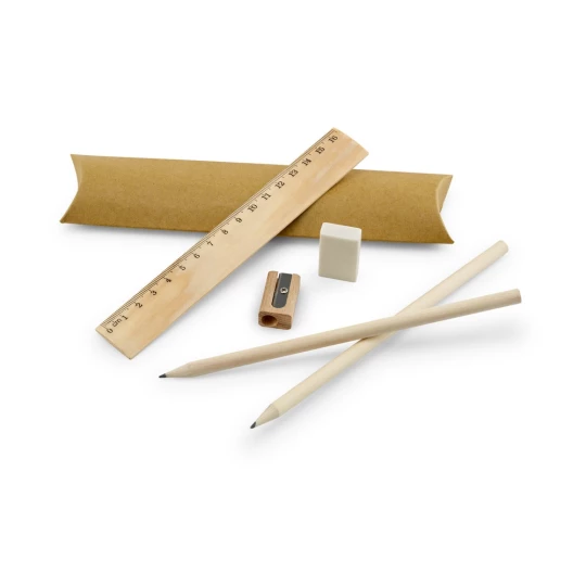 Zestaw do pisania zawierający linijkę 16.5 cm, 2 ołówki grafitowe HB, 1 gumkę i 1 temperówkę. Dostarczany w kartonowym etui. Etui: 190 x 45 x 20 mm