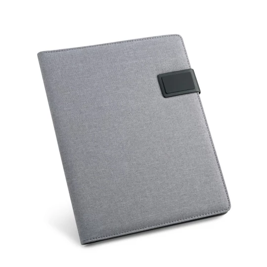 Teczka A4 wykonana z imitacji lnu i i PU. Posiada magnetyczne zamknięcie z płytką z możliwością personalizacji, blok z 40 liniowanymi stronami (60 g/m²), uchwyt na długopis (nie jest dołączony), kieszeń na smartfona i uchwyty na kable lub inne akcesoria (nie dołączone). 233 x 310 x 18 mm | Metalowa płytka: 50 x 30 mm