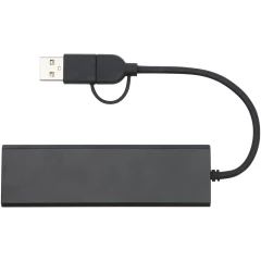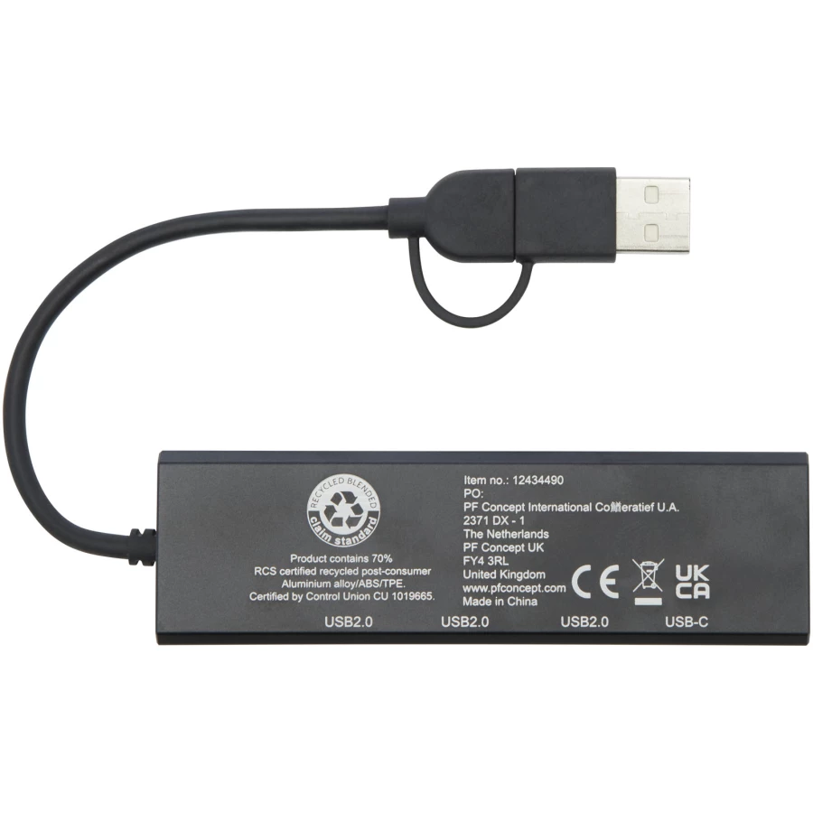 Koncentrator USB 2.0 wykonany z aluminium pochodzącego z recyklingu z certyfikatem RCS z elegancką prostokątną obudową z aluminium pochodzącego z recyklingu. Posiada 3 porty USB 2.0 i 1 port PD typu C (Power Delivery), który umożliwia przesyłanie danych z prędkością do 480 Mb/s. Dołączony adapter wejściowy typu C umożliwia korzystanie z tego urządzenia zarówno z notebookami, jak i komputerami wyposażonymi zarówno w złącza USB-A, jak i typu C. Dostarczany w pudełku wykonanym w 100% z papieru Kraft z recyklingu z kolorową naklejką.