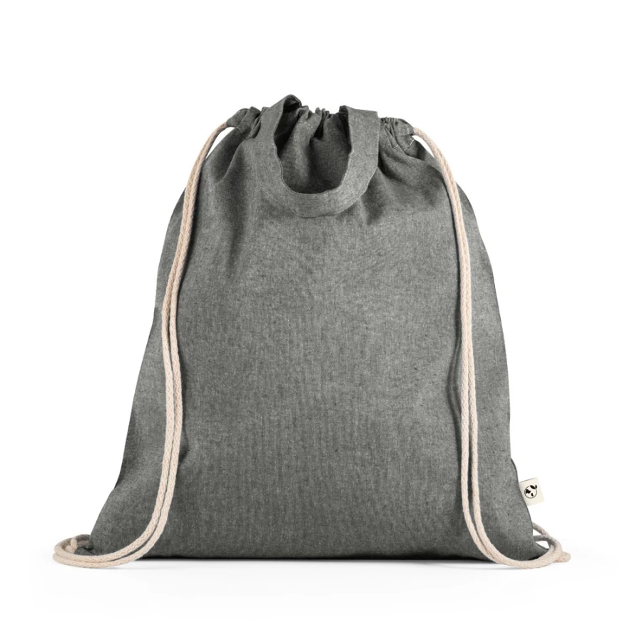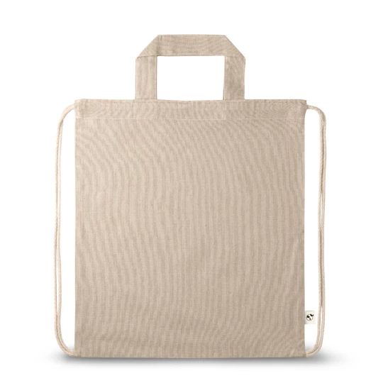 Worek zawierający bawełnę z recyklingu (70%) i poliester (30% rPET) (140 g/m²), z 30 cm uchwytami i bawełnianymi sznurkami do zamykania. Bawełna z recyklingu jest niebarwiona. Surowiec jest używany w swojej oryginalnej formie i kolorze, bez użycia barwiących lub wybielających chemikaliów, co przyczynia się do zmniejszania negatywnego wpływu na środowisko. 370 x 410 mm