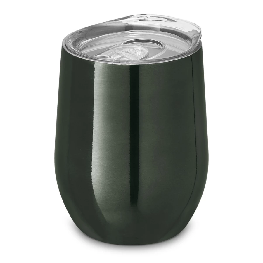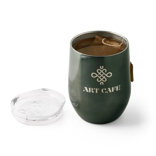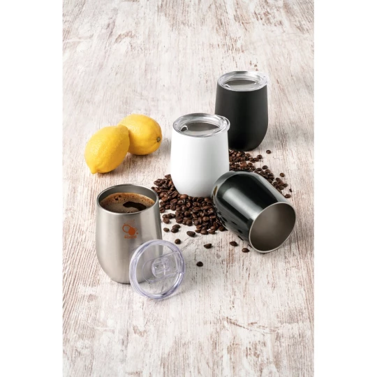Termiczny kubek podróżny z podwójną ścianką ze stali nierdzewnej z izolacją próżniową. Przesuwana pokrywka i pojemność do 400 mL. Dostarczany w pudełku. 88 x 112 mm