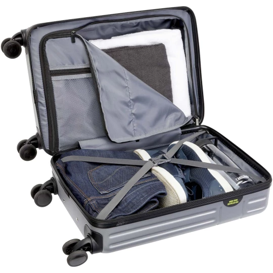 Twarda walizka na kółkach Rover o wysokości 51 cm, wyprodukowana z odpornych na uderzenia tworzyw sztucznych pochodzących z recyklingu i wyściółki RPET to produkt zarówno wysokiej jakości, jak i przyjazny dla środowiska. Posiada aluminiową ramę z podwójnymi rurkami, 4-kołowy mechanizm obrotowy 360 stopni, zintegrowany zamek szyfrowy TSA, wygodny uchwyt zapewniający komfort i wewnętrzne przegródki organizacyjne. Może być przewożona jako bagaż podręczny w większości głównych linii lotniczych. Walizka posiada certyfikat GRS, łącznie z nadrukiem, co sprawia, że jest wyborem bardziej przyjaznym dla środowiska.
