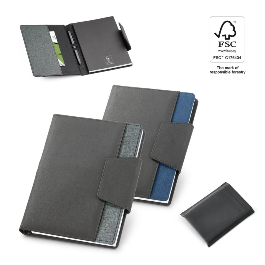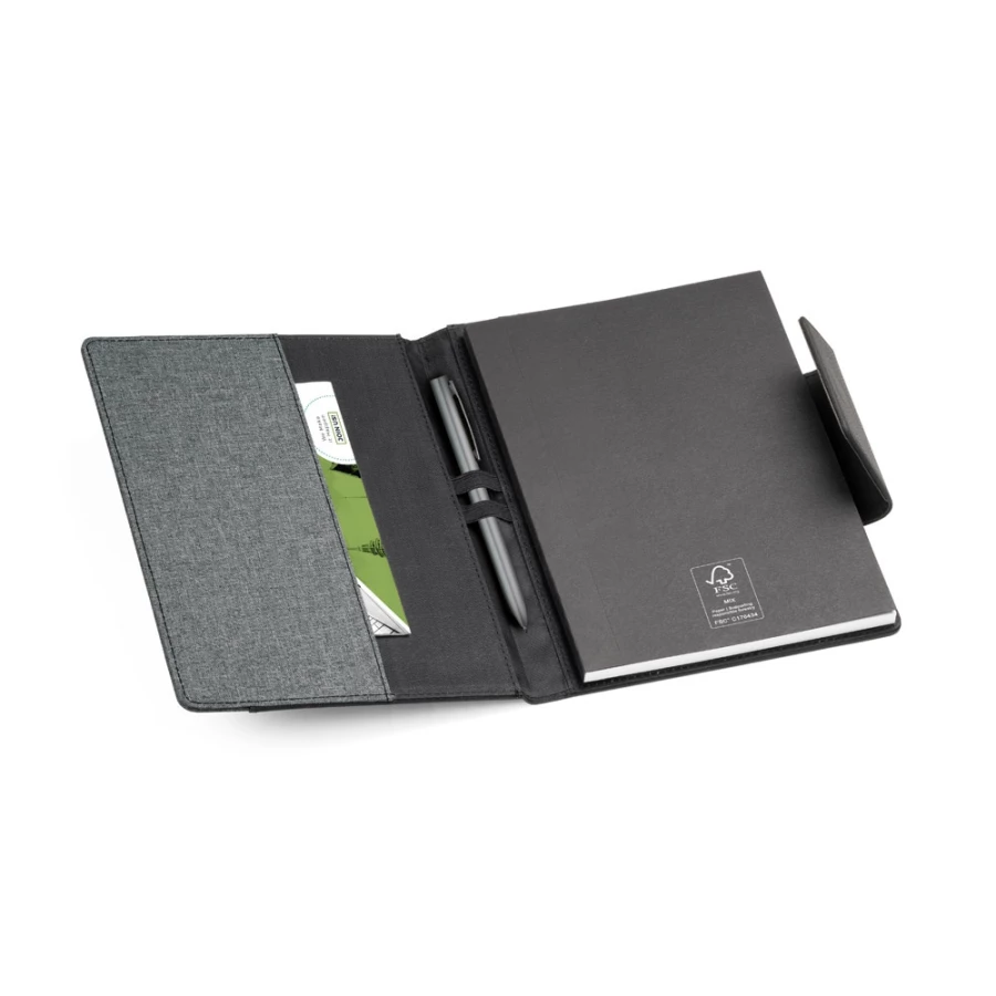Teczka wykonana z PU i poliestru, z notesem A5 w środku. Teczka posiada magnetyczne zamknięcie, zewnętrzną i wewnętrzną kieszeń, a także uchwyt na długopis (długopis nie jest dołączony). Wyjmowany notatnik posiada 160 czystych stron (70 g/m²), wykonany z materiałów z certyfikatem FSC™ i innych kontrolowanych materiałów. Dostarczana w etui z materiału non-woven. 155 x 215 mm | Etui: 205 x 250 mm