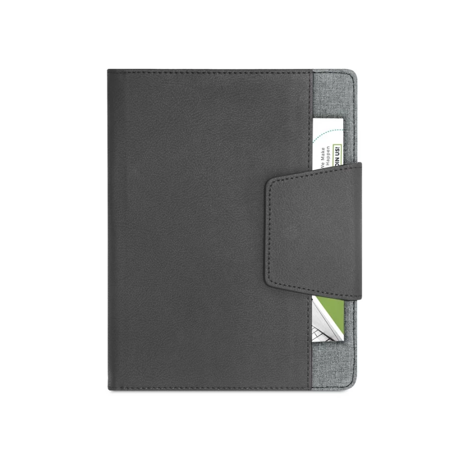 Teczka wykonana z PU i poliestru, z notesem A5 w środku. Teczka posiada magnetyczne zamknięcie, zewnętrzną i wewnętrzną kieszeń, a także uchwyt na długopis (długopis nie jest dołączony). Wyjmowany notatnik posiada 160 czystych stron (70 g/m²), wykonany z materiałów z certyfikatem FSC™ i innych kontrolowanych materiałów. Dostarczana w etui z materiału non-woven. 155 x 215 mm | Etui: 205 x 250 mm