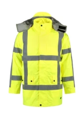 odzież o wysokiej widoczności, wodoodporny, wiatroodporny i oddychający materiał, odblaskowe paski, odpinany kaptur, otwory wentylacyjne pod pachami, wewnętrzne kieszenie na piersi, dwukierunkowy zamek błyskawiczny otwarty na końcu, woododporne zamki , klejone szwy, wyjmowana podpinka ocieplająca, certyfikacja zgodnie z normami EN ISO 20 471:2013(klasa 3), EN 343:2003 (klasa 3:1), Tricorp kod produktu: 403005