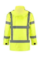 odzież o wysokiej widoczności, wodoodporny, wiatroodporny i oddychający materiał, odblaskowe paski, odpinany kaptur, otwory wentylacyjne pod pachami, wewnętrzne kieszenie na piersi, dwukierunkowy zamek błyskawiczny otwarty na końcu, woododporne zamki , klejone szwy, wyjmowana podpinka ocieplająca, certyfikacja zgodnie z normami EN ISO 20 471:2013(klasa 3), EN 343:2003 (klasa 3:1), Tricorp kod produktu: 403005