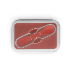 Wysuwane hermetyczne pudełko wykonane z silikonu i PP, z 1 przegrodą o pojemności do 640 mL. W górnej części wieczka znajduje się miejsce na przechowywanie dołączonego do zestawu widelca i noża (2 w 1). Nadaje się do użytku w kuchence mikrofalowej (należy zdjąć wieczko). 160 x 110 x 66 mm | Złożone: 160 x 110 x 40 mm