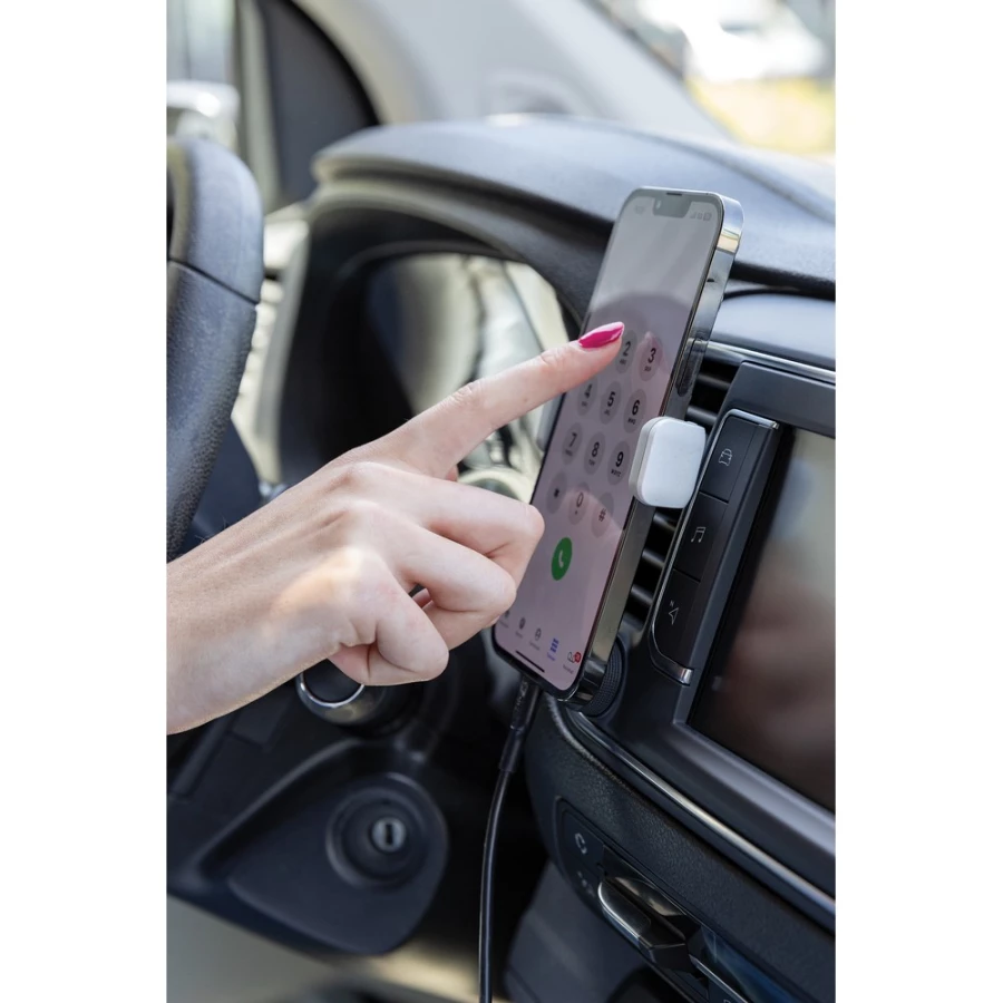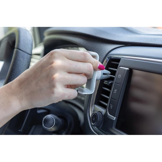 Regulowany samochodowy uchwyt do telefonu, mocowanie do wentylacji, obrotowy (360 stopni), wykonany w 37% z materiałów z recyklingu, mechanizm ze stali nierdzewnej wewnątrz, ślad węglowy produktu: 0,13 kg CO2
