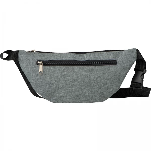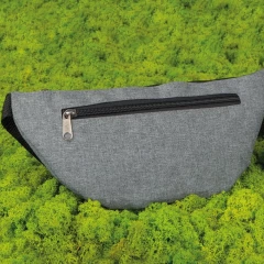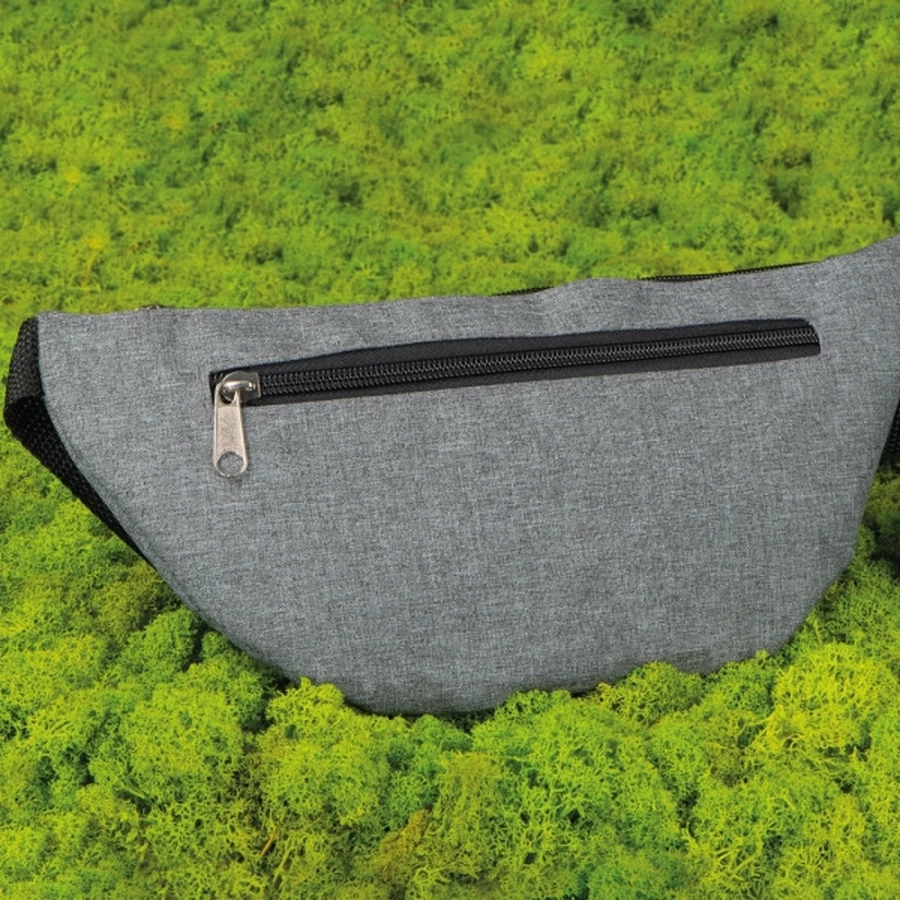 Saszetka nerka na pasku, wykonana z poliestru. Posiada przegrodę główną i dodatkową kieszonkę z przodu - obydwie zamykane na zamek.