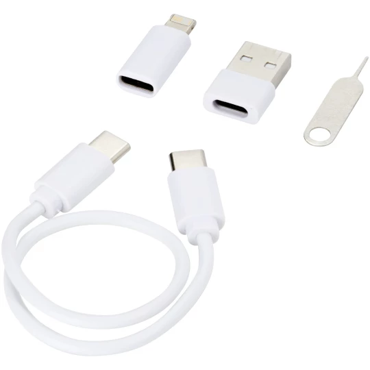 Modułowy kabel do transmisji danych i ładowania wykonany z tworzyw sztucznych pochodzących z recyklingu, dostarczany w eleganckim pudełku do przechowywania, które służy również jako stojak na telefon. Kabel oferuje wiele rozwiązań w zakresie ładowania: Wejście typu C i USB-A oraz wyjście typu C/iOS/micro USB. Dzięki tym wszystkim adapterom i złączom kabel ten umożliwia ładowanie większości smartfonów, aparatów fotograficznych, powerbanków, słuchawek dousznych itp. Kabel ma maksymalną moc wyjściową 2 A. Posiada wysuwaną szpilkę, która przydaje się zawsze, gdy trzeba wyjąć kartę SIM z telefonu. Pudełko do przechowywania ma również miejsce na kartę pamięci micro SD, a także kartę nano SIM, dzięki czemu jest to idealne akcesorium podróżne. Długość kabla: 26 cm. Dostarczany w kopercie z papieru Kraft pochodzącego w 100% z recyklingu.