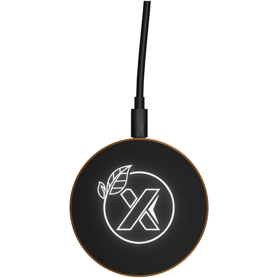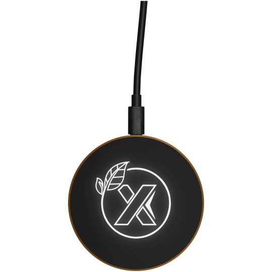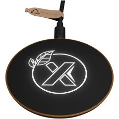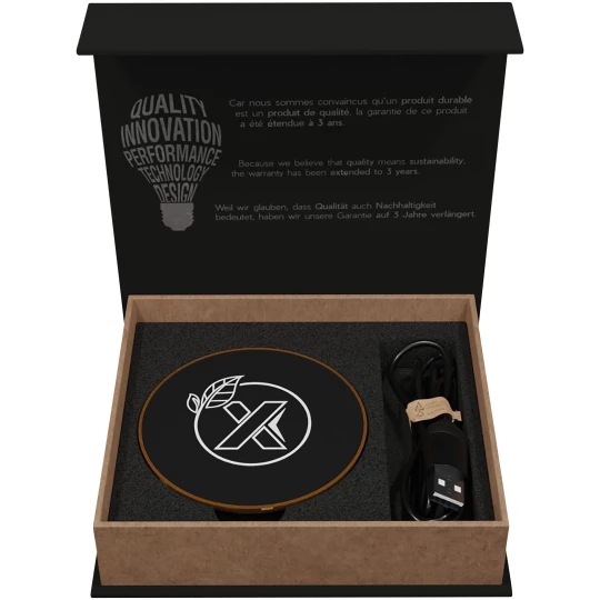 Bezprzewodowa stacja ładująca o mocy 10 W wykonana z gumy i drewna z certyfikatem FSC, z kablem ładującym wykonanym z plastiku z recyclingu. Może być ozdobiona podświetlanym logo. Dostarczana w czarnym pudełku upominkowym typu kraft z magnetycznym zamknięciem. Patent EUROPE EUIPO.
