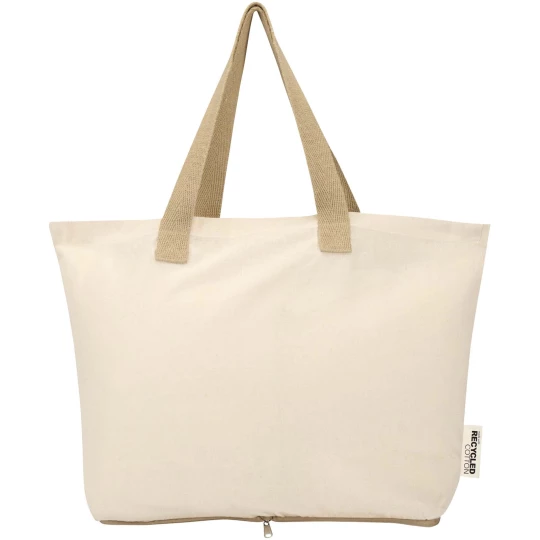 Lekka i praktyczna, składana torba na zakupy Sierra jest wykonana w 100% z certyfikowanej przez GRS bawełny z recyklingu o gramaturze 140 g/m² i zapewnia równowagę między uniwersalnością a trwałością. Można ją starannie złożyć do dołączonej kieszonki zapinanej na zamek błyskawiczny znajdującej się na dole, dzięki czemu jest kompaktowa i łatwa do przenoszenia. Torba o pojemności 10 kg doskonale nadaje się na zakupy, do załatwiania spraw lub w podróży i jest wyposażona w podwójne uchwyty, które zapewniają dodatkowe wsparcie i wygodę podczas przenoszenia cięższych ładunków. Pojemność: 7 litrów.