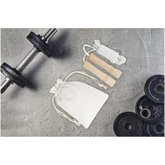 Dzięki tej skakance dla dorosłych możesz połączyć dobrą zabawę z ćwiczeniami. Lina wykonana jest z bawełny, a uchwyty z drewna bukowego. Długość liny wynosi 310 cm, co pozwala na łatwe skakanie dorosłym o wzroście do 195 cm. Uchwyty (12 x 2,5 cm) są ergonomicznie ukształtowane, zapewniając wygodny chwyt. Dostarczana z bawełnianym woreczkiem do przechowywania (18 x 13 cm). Jako opcja trwałej dekoracji zalecany jest grawer laserowy.