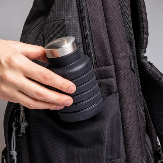 Silikonowa butelka, o pojemności 500 ml, którą po opróżnieniu zawartości można złożyć w kompaktową harmonijkę.