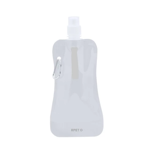 Składany bidon 400 ml z karabińczykiem umożliwiającym przypinanie, dziubek ułatwiający picie, po złożeniu może zmieścić się nawet w kieszeni, produkt wykonany z RPET