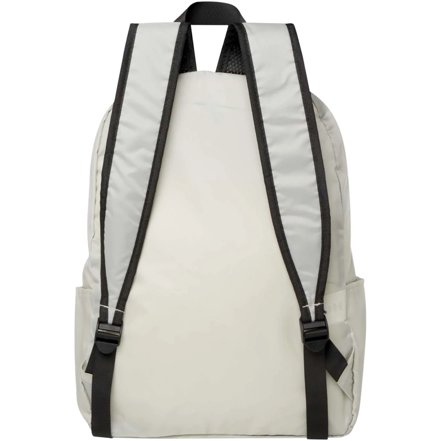 Ten zaprojektowany z myślą o wygodzie i praktyczności lekki, a zarazem wytrzymały plecak dopasowuje się do Twoich potrzeb. Możesz złożyć go i umieścić w kompaktowym woreczku, który posiada specjalną pętlę do zawieszenia, umożliwiającą łatwe powieszenie i przenoszenie. To sprawia, że plecak idealnie nadaje się dla podróżników, piechurów i do codziennego użytku. Posiada główną komorę zapinaną na zamek, przednią kieszeń zapinaną na zamek, dwie kieszenie boczne i regulowane szelki. Wykonany z poliestru pochodzącego z recyklingu, wolnego od PVC. Pojemność: 15 litrów.