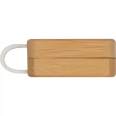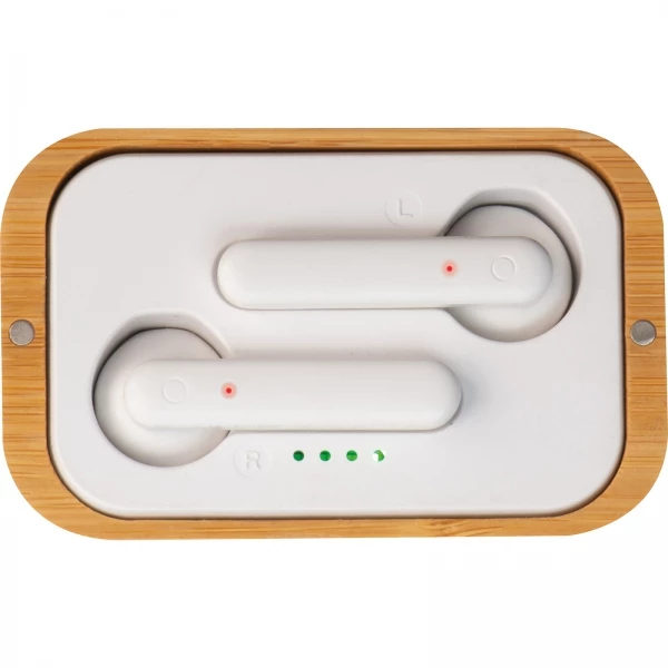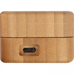 Bezprzewodowe słuchawki douszne z Bluetooth 5.0. Bambusowe etui jest jednocześnie stacją ładującą USB. Zasięg do 10 metrów, czas ładowania ok. 1 godziny, czas pracy 2-3 godziny i bateria 300 mAh.