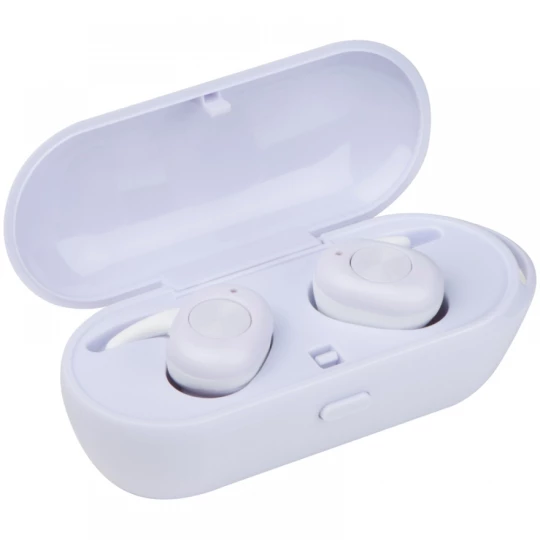 Plastikowe (ABS) słuchawki douszne Bluetooth. W zestawie z kabelkiem do ładowania i stacją ładującą, która służy również jako opakowanie. Czas grania 2-3 godziny, czas ładowania ok. 1 godzina, bateria 35 mAh.