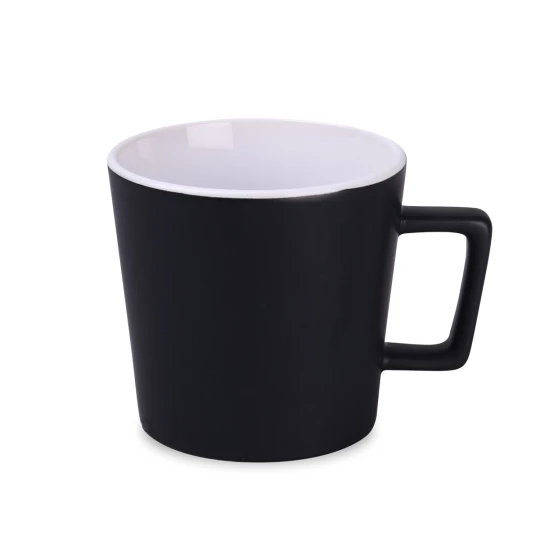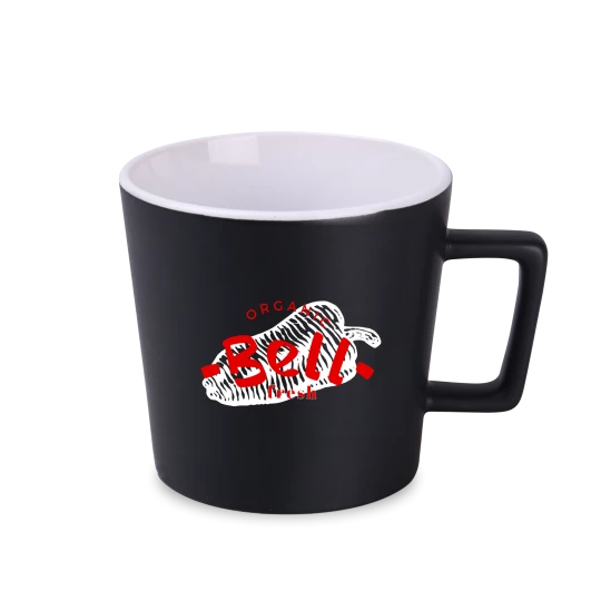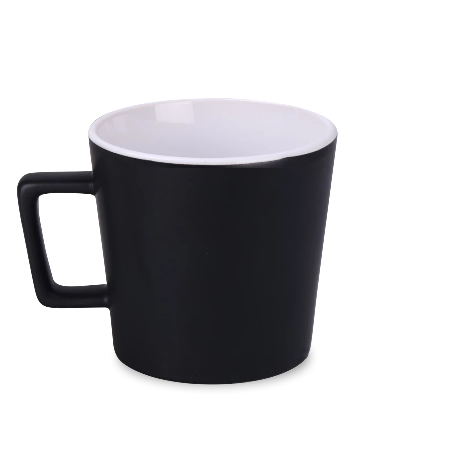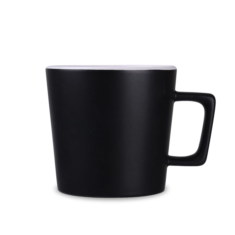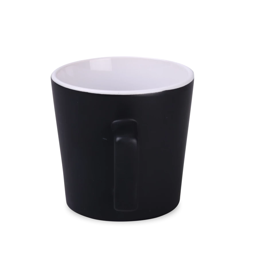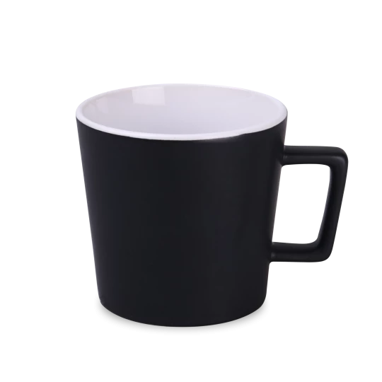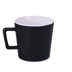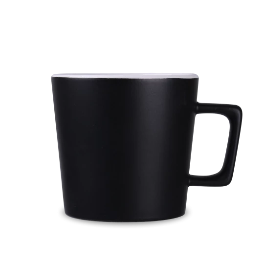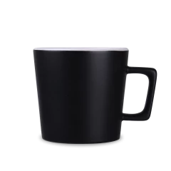 Nowoczesny kubek z czarną matową powierzchnią. Posiada ucho o ciekawym, designerskim kształcie. Posiada wnętrze w kilku kolorach.