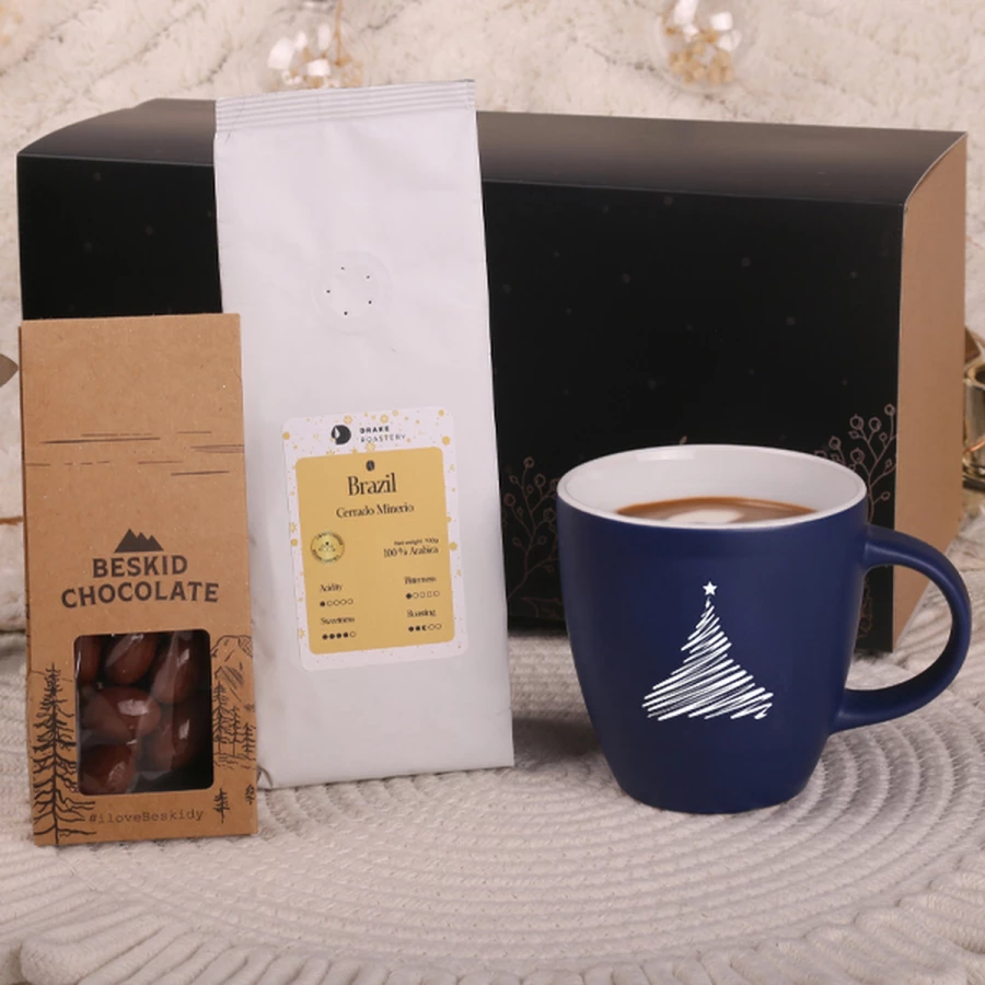 Efektowny, wyróżniający się wyjątkową matową powierzchnią kubek Fiord Matt w połączeniu z pełną aromatu kraftową kawą mieloną Arabica Brazil Cerrado Mineiro 100g oraz migdałami zatopionymi w mlecznej czekoladzie 50g. PREZENTOWANE ZDOBIENIE MA CHARAKTER POGLĄDOWY I NIE JEST WLICZONE W CENĘ PRODUKTU. ZESTAW DOSTĘPNY W DEDYKOWANYM OPAKOWANIU MERRY Z WYBRANĄ OPCJĄ ZDOBIENIA.