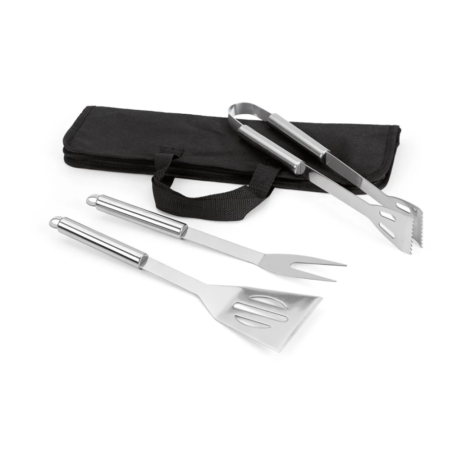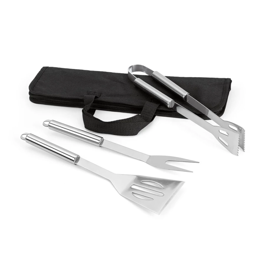 Zestaw do grillowania zawierający 3 elementy ze stali nierdzewnej: szczypce, widelec, szpatułkę. Dostarczany w worku z materiału non-woven z uchwytami. Torba: 405 x 120 x 25 mm