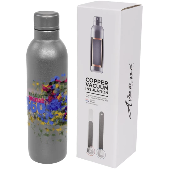 Trwały bidon-termos izolowany próżniowo i miedzią, sprawia, że zawartość pozostanie zimna przez 48 godzin lub ciepła przez min 12 godzin. Dzięki takiej konstrukcji para nie osadza się na zewnętrzu bidonu. Modne i trwałe malowanie proszkowe. Nakręcane wieczko ze stali nierdzewnej, które zapobiega rozlaniu. Pojemność 510ml. Zapakowana w pudełko upominkowe Avenue.