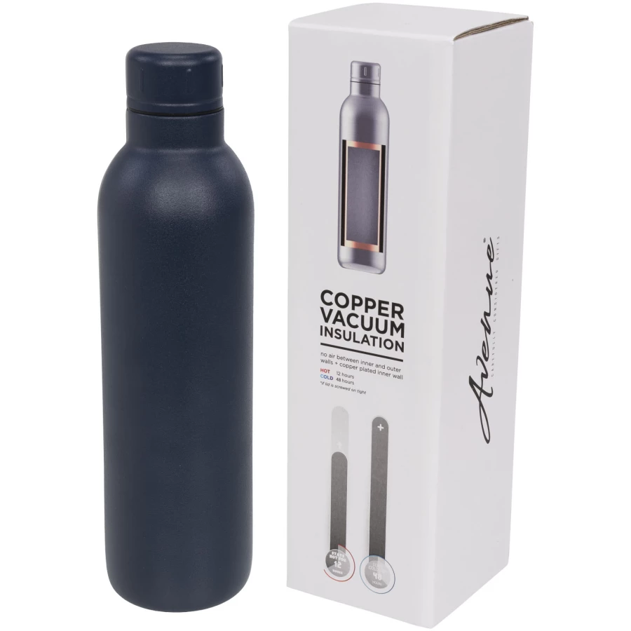 Trwały bidon-termos izolowany próżniowo i miedzią, sprawia, że zawartość pozostanie zimna przez 48 godzin lub ciepła przez min 12 godzin. Dzięki takiej konstrukcji para nie osadza się na zewnętrzu bidonu. Modne i trwałe malowanie proszkowe. Nakręcane wieczko ze stali nierdzewnej, które zapobiega rozlaniu. Pojemność 510ml. Zapakowana w pudełko upominkowe Avenue.