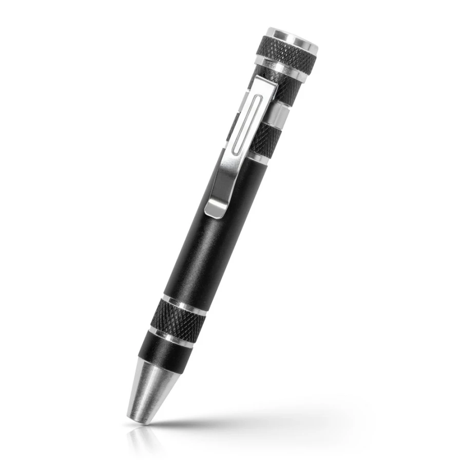 Śrubokręt w kształcie długopisu z 4 płaskimi i 4 krzyżakowymi końcówkami, posiada klip umożliwiający przypinanie, produkt wykonany z aluminium i stali