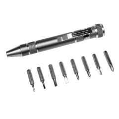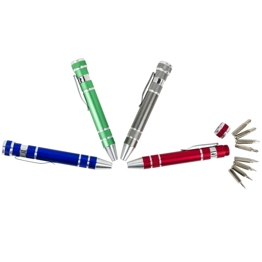 Śrubokręt w kształcie długopisu z 4 płaskimi i 4 krzyżakowymi końcówkami, posiada klip umożliwiający przypinanie, produkt wykonany z aluminium i stali